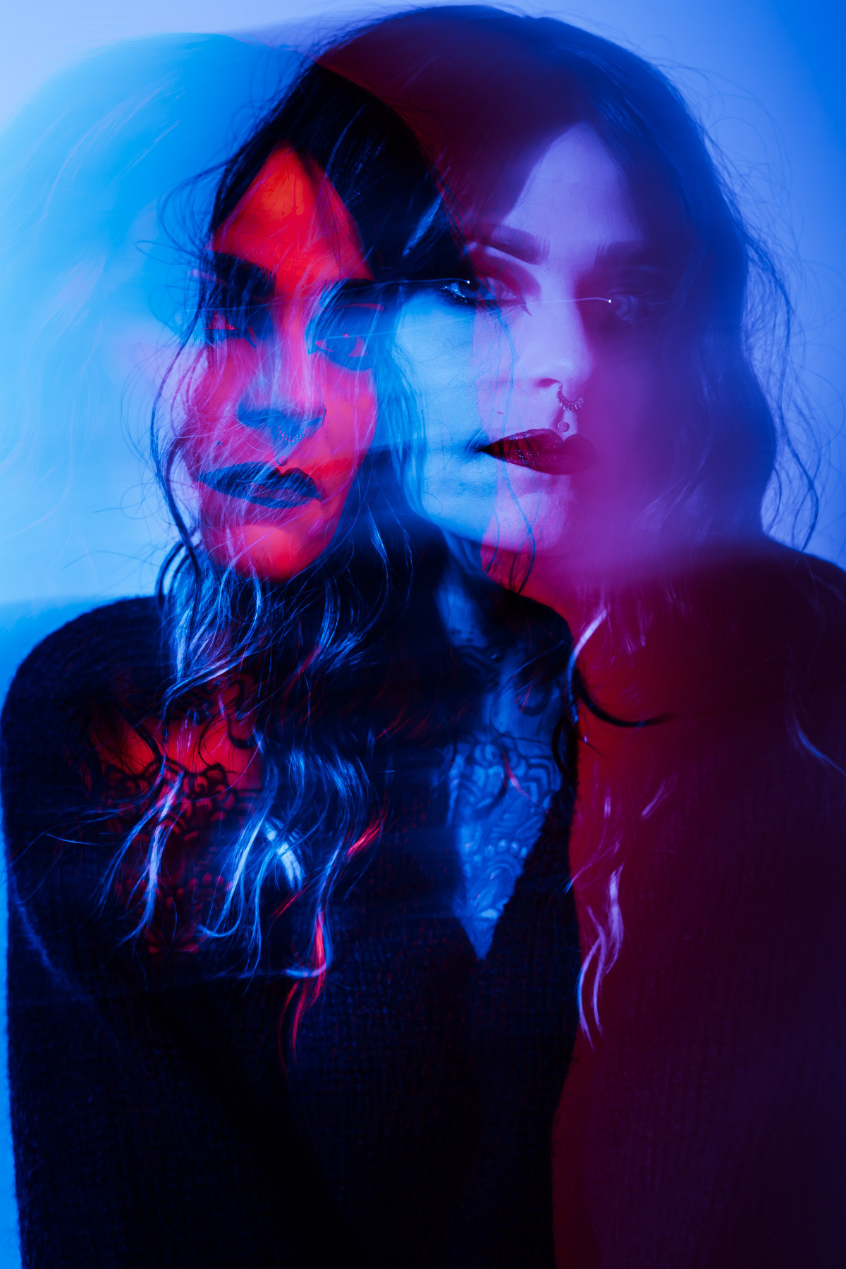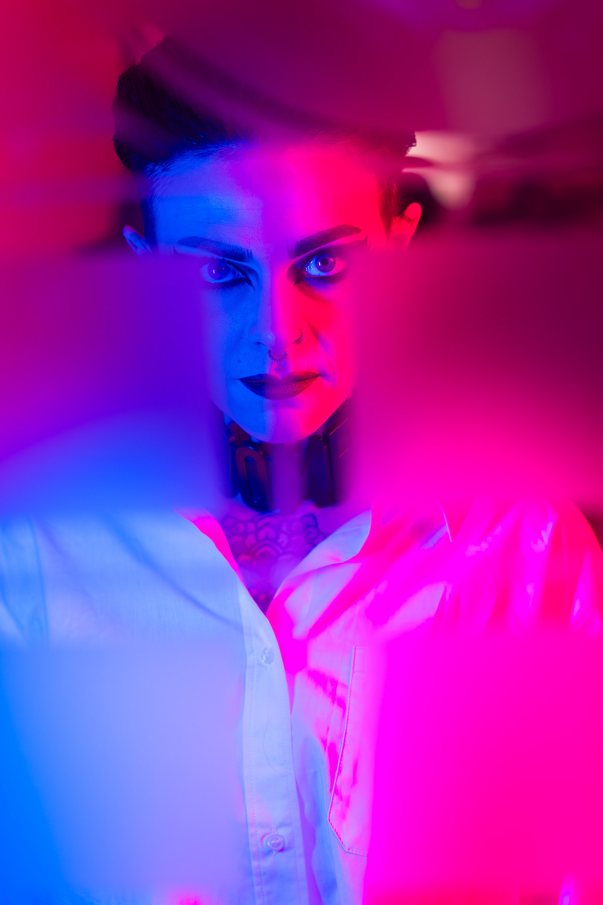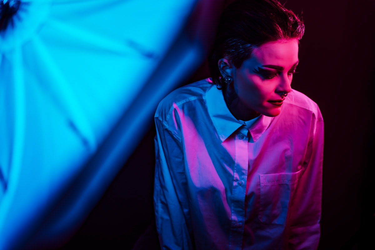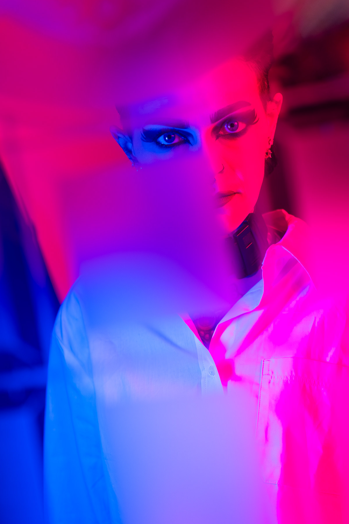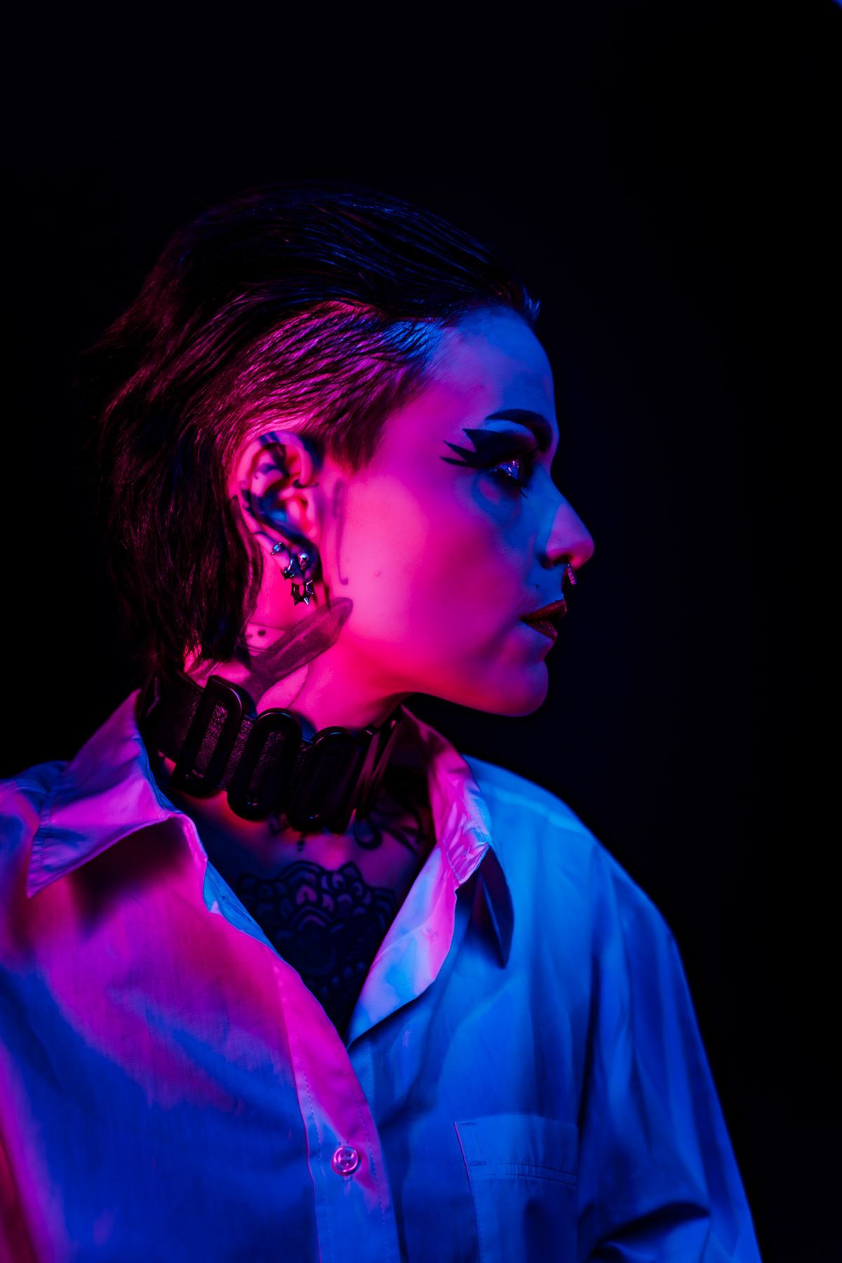 In deze reeks speel ik met kleur die meer doet dan alleen verlichten. Neon blauw en rood vormen hier geen decor, maar een tweede huid. Ze benadrukken lijnen, emoties en details die in gewoon daglicht misschien minder opvallen.