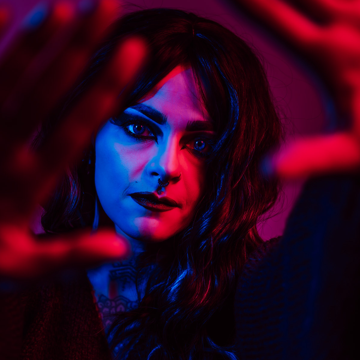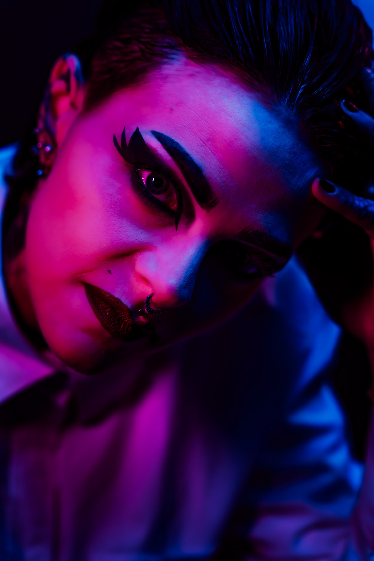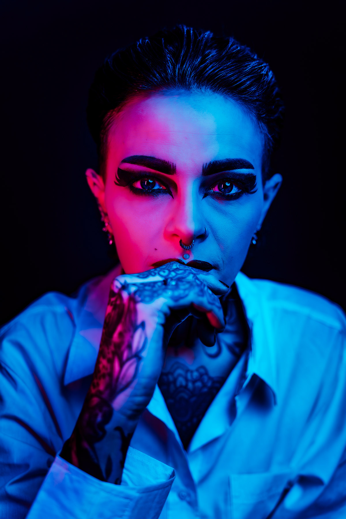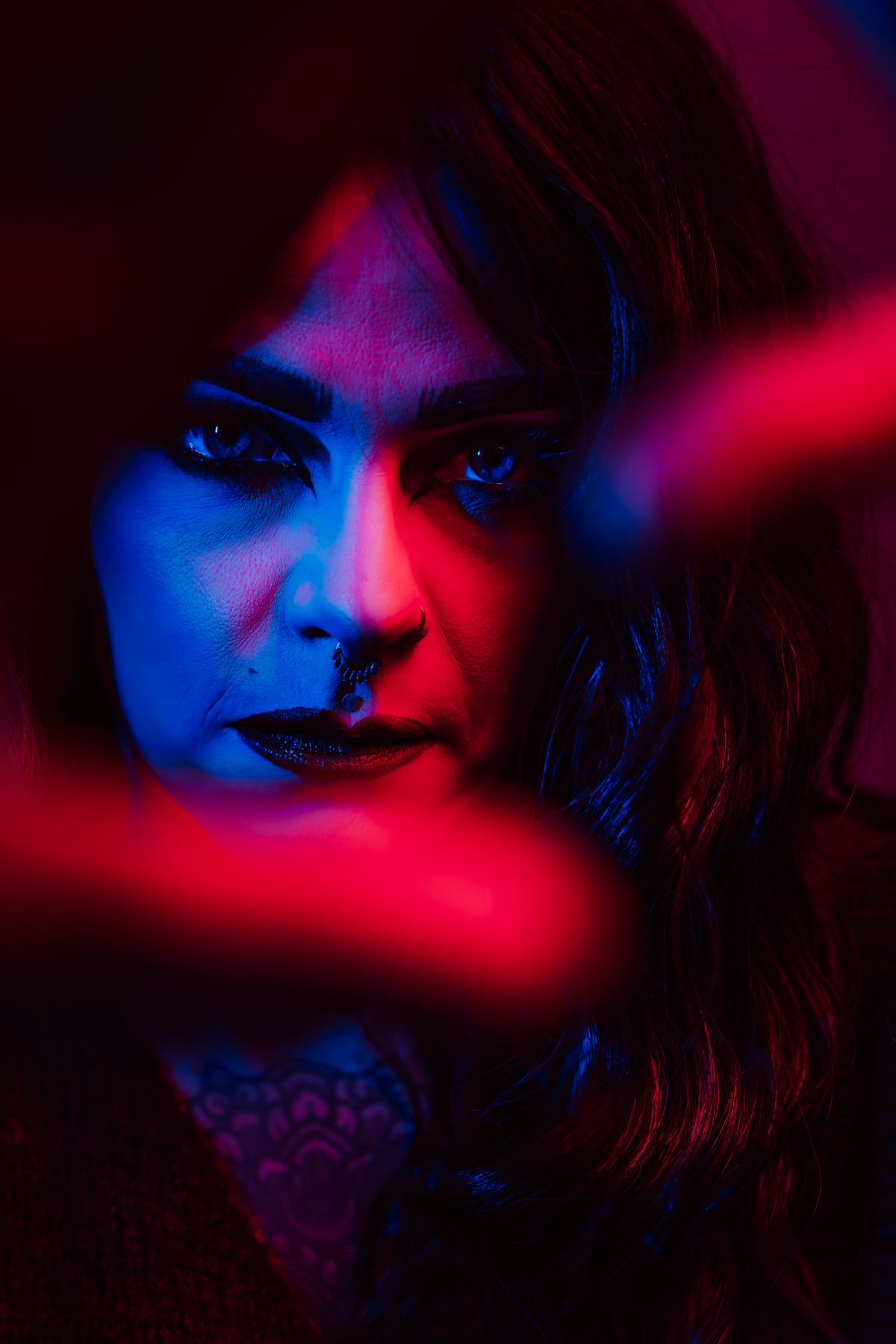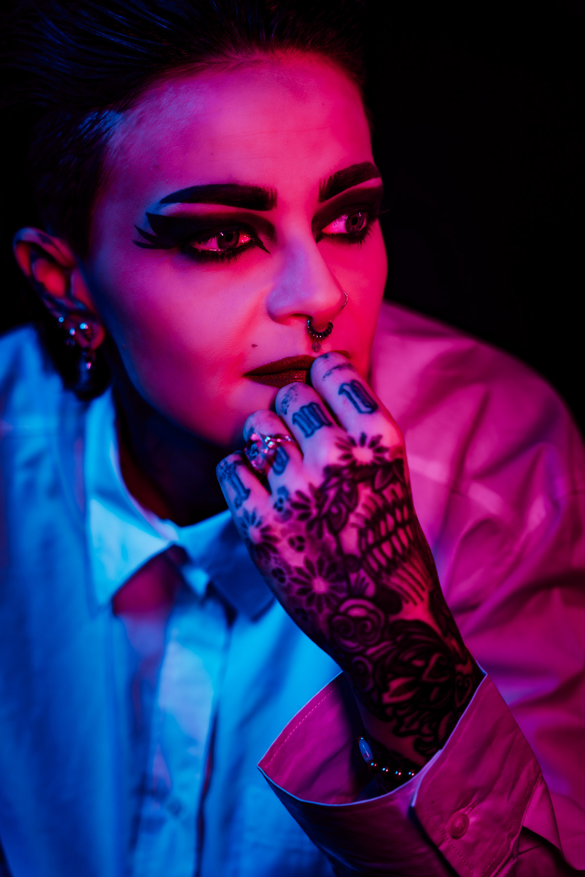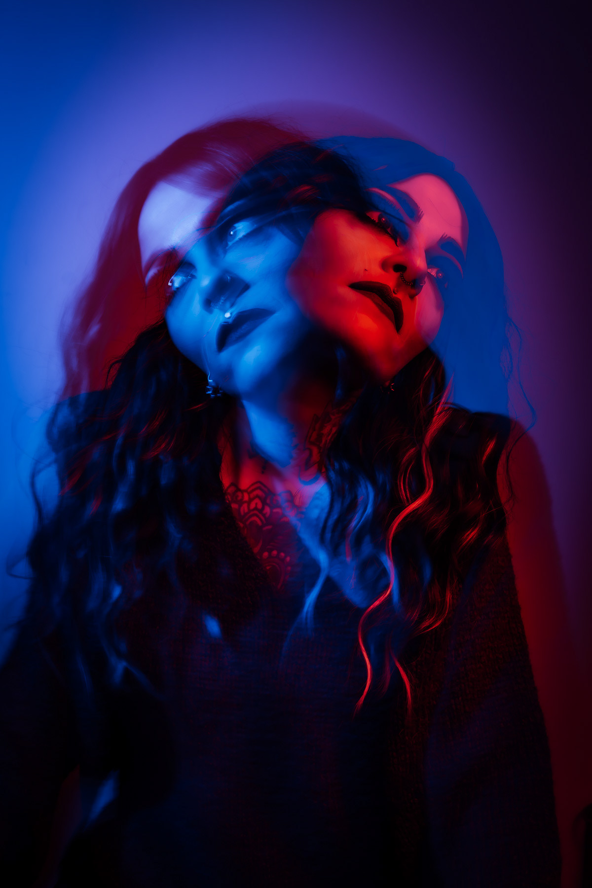 In deze reeks speel ik met kleur die meer doet dan alleen verlichten. Neon blauw en rood vormen hier geen decor, maar een tweede huid. Ze benadrukken lijnen, emoties en details die in gewoon daglicht misschien minder opvallen.