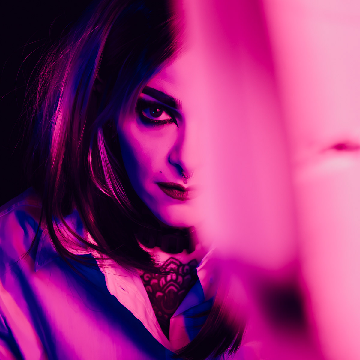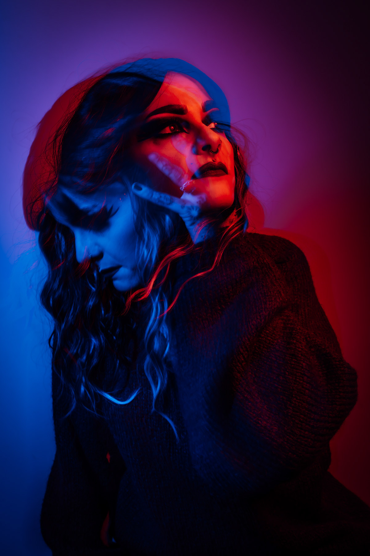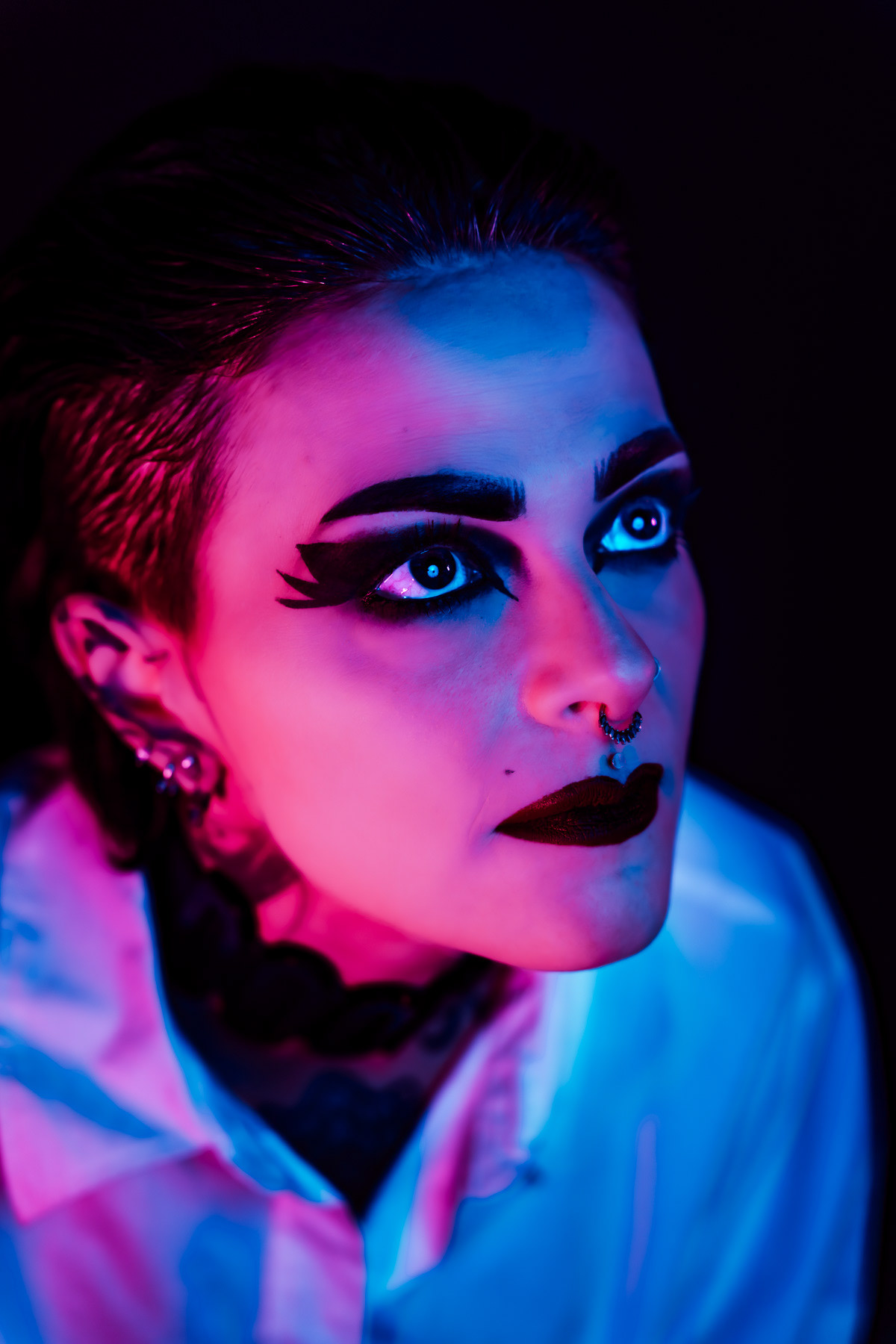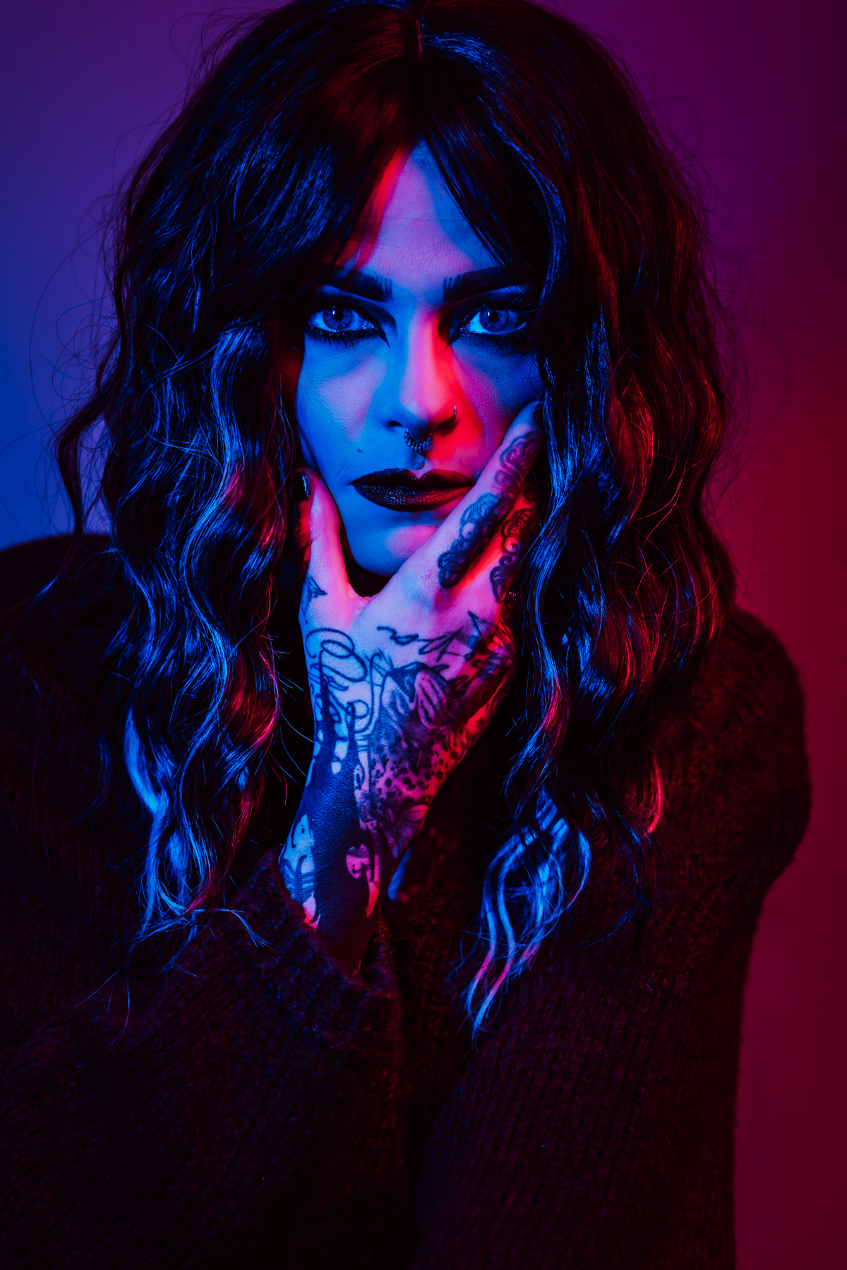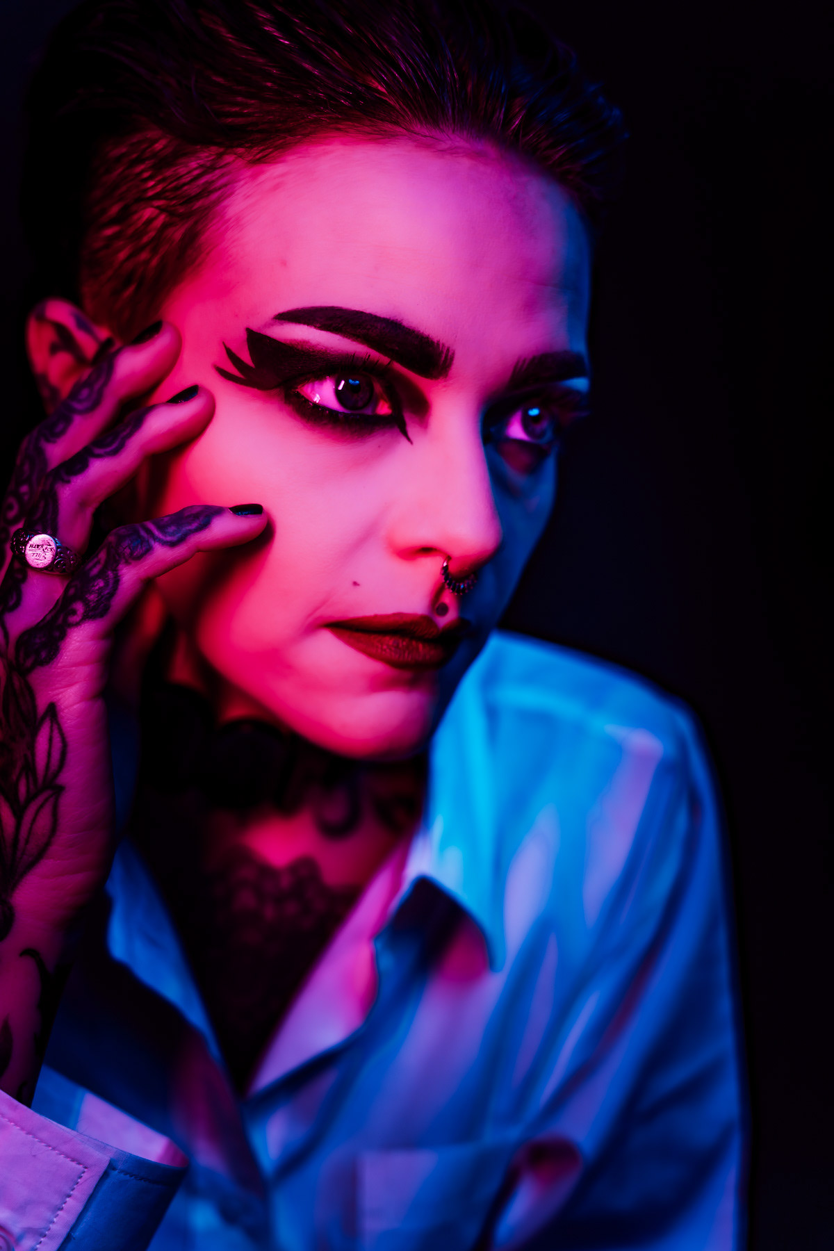 In deze reeks speel ik met kleur die meer doet dan alleen verlichten. Neon blauw en rood vormen hier geen decor, maar een tweede huid. Ze benadrukken lijnen, emoties en details die in gewoon daglicht misschien minder opvallen.