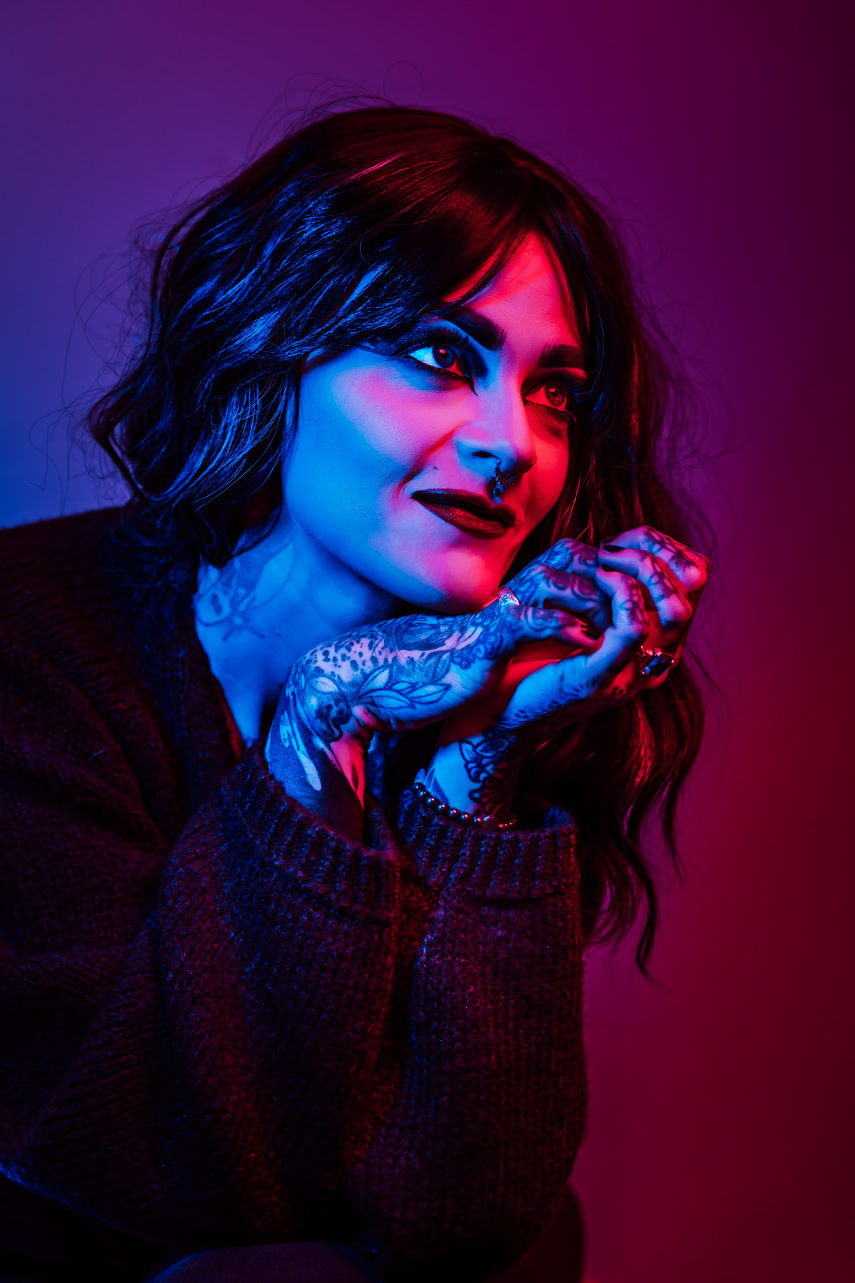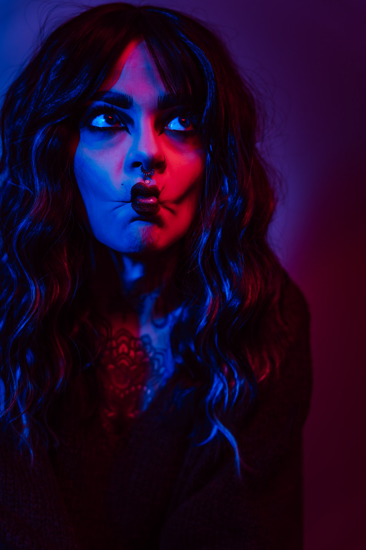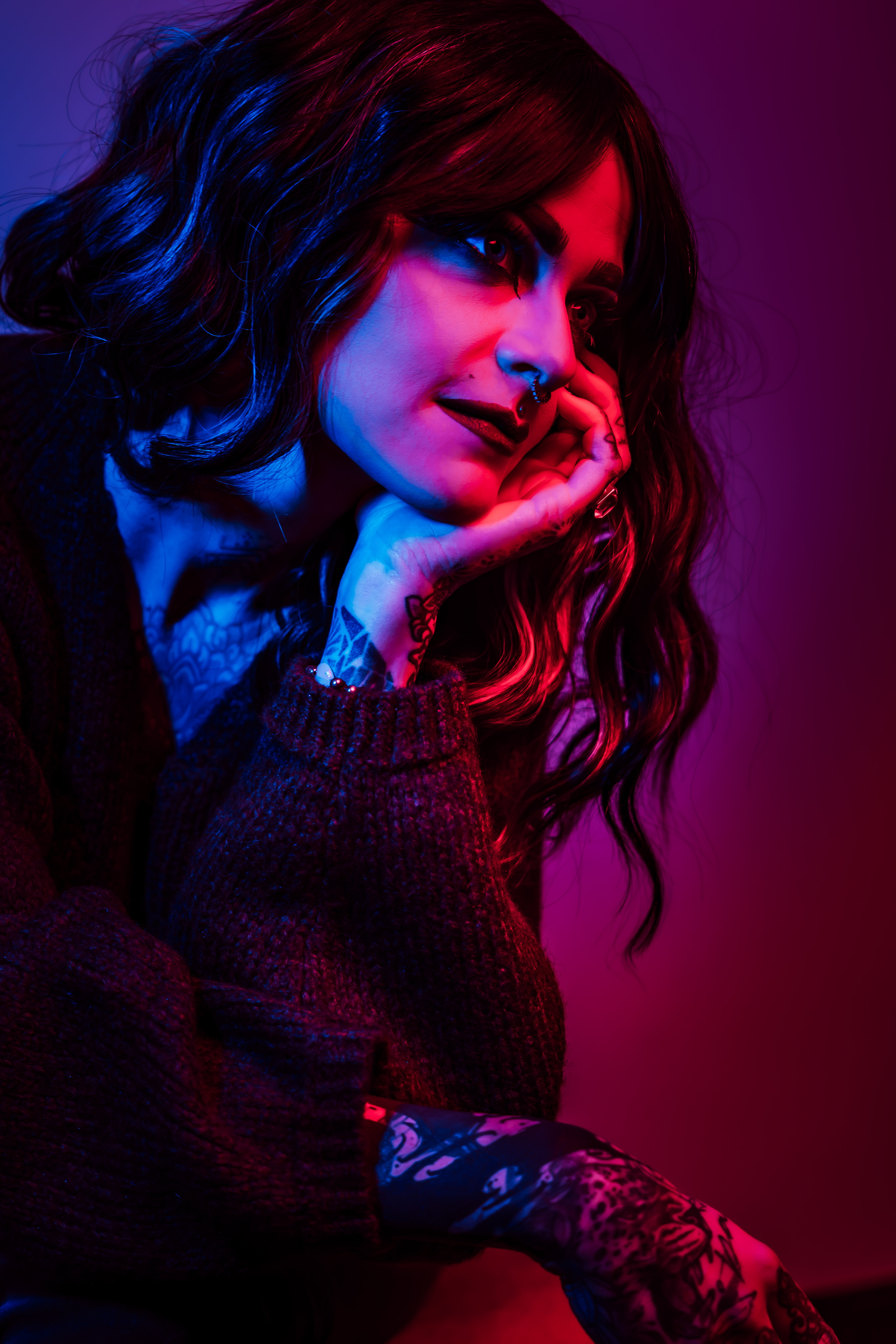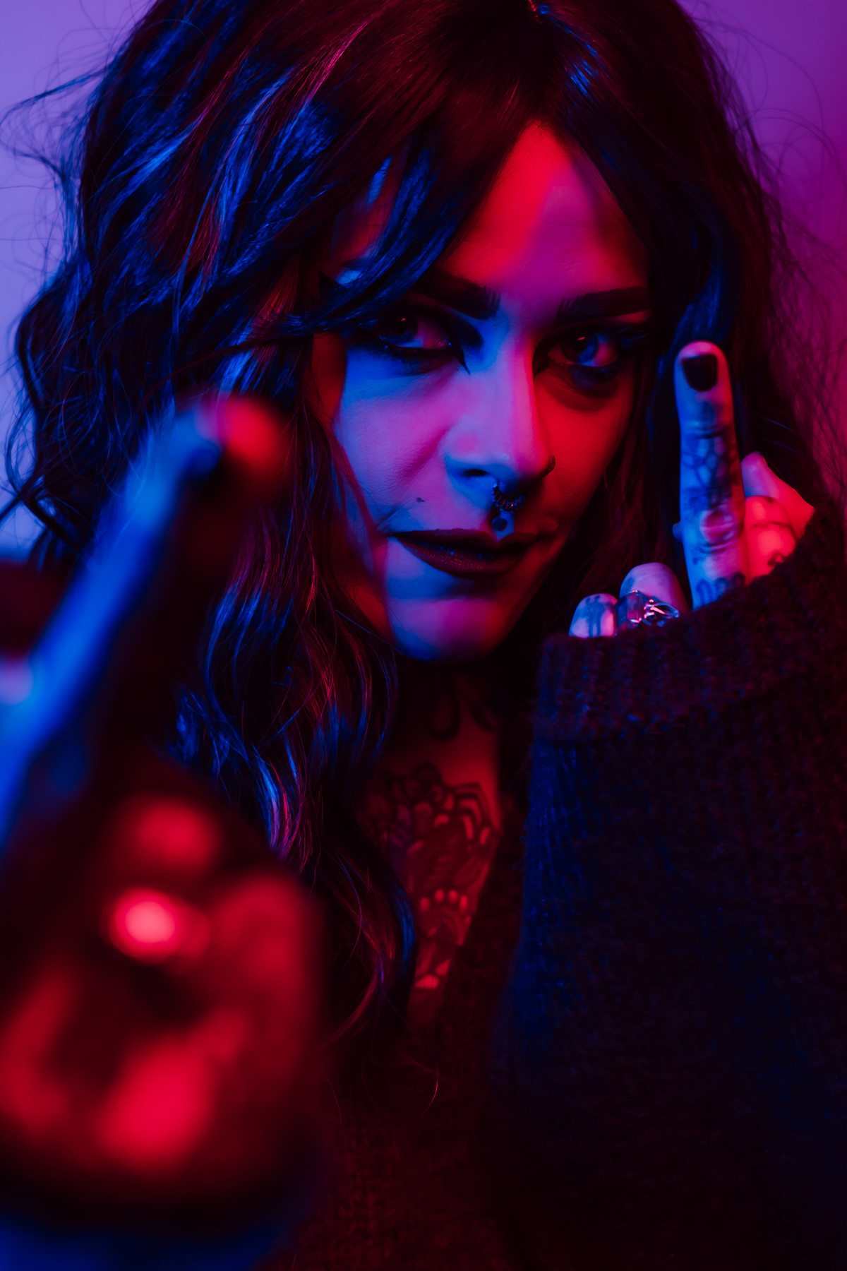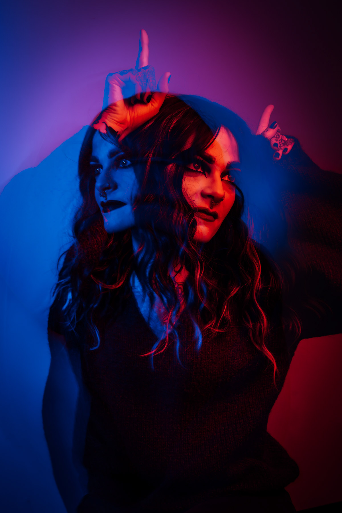 In deze reeks speel ik met kleur die meer doet dan alleen verlichten. Neon blauw en rood vormen hier geen decor, maar een tweede huid. Ze benadrukken lijnen, emoties en details die in gewoon daglicht misschien minder opvallen.
